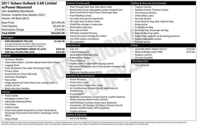 Whether you're embarking on a family road trip, tackling the great outdoors, or simply commuting in style, this 2011 Subaru Outback 3.6R Limited is the perfect choice. Visit us today to experience the exceptional quality and versatility that this Outback has to offer. We're confident you'll be impressed by its combination of performance, comfort, and advanced technology.