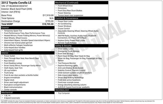 Whether you're looking for a reliable daily driver or a practical family car, this 2012 Toyota Corolla LE is an exceptional choice. With its well-equipped interior, efficient performance, and comprehensive safety features, it's a vehicle that checks all the boxes. We invite you to come and experience the Corolla for yourself. Schedule a test drive today and let us show you why this compact sedan is the perfect fit for your lifestyle.