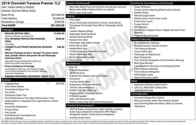 Discover the exceptional 2018 Chevrolet Traverse Premier, a versatile and well-equipped SUV that offers the perfect blend of style, performance, and functionality. This stunning Traverse boasts a sleek white exterior, complemented by a range of premium features that elevate the driving experience.- REDLINE EDITION: Includes 20 Gloss Black painted aluminum wheels with Red accents, Gloss Black window surround, Dark tail lamps, Black mirror caps and door handles, and more.- Dual SkyScape 2-Panel Power Sunroof: Enjoy the open-air feeling and let natural light flood the cabin.- Navigation System: Seamlessly navigate your journeys with the intuitive Chevrolet MyLink infotainment system.- Bose Premium 10-Speaker Audio System: Immerse yourself in a concert-quality audio experience.- Heated and Ventilated Front Seats: Stay comfortable in any weather with these luxurious features.- Heated Rear Seats: Ensure your passengers enjoy the same level of comfort.Under the hood, the Traverse Premier is powered by a robust 3.6L V6 SIDI VVT engine, paired with a 9-speed automatic transmission and all-wheel drive. This powertrain delivers an impressive balance of power and efficiency, with an EPA-estimated 25 mpg on the highway.Beyond its impressive performance, the Traverse Premier offers a spacious and versatile interior, with seating for up to seven passengers. The split-folding third-row seats and generous cargo space make it the ideal companion for family adventures, weekend getaways, and everything in between.Safety is also a top priority, with features like Forward Collision Alert, Automatic Emergency Braking, and Lane Keep Assist, helping to provide added peace of mind on the road.Experience the exceptional 2018 Chevrolet Traverse Premier for yourself. Visit our showroom today and let our knowledgeable sales team guide you through all the features and capabilities that make this SUV a standout choice in its class.