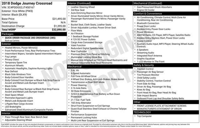 Discover the ultimate family-friendly SUV with the 2018 Dodge Journey Crossroad. This exceptional vehicle combines style, performance, and unparalleled versatility, making it the perfect choice for your next adventure.Boasting a powerful 3.6L V6 engine and All-Wheel Drive, the Journey Crossroad delivers a thrilling driving experience with impressive fuel efficiency. Standout features include:• Quick Order Package 28S Crossroad• ParkView Rear Back-Up Camera• Light Gray Accent Stitching• 6-Speaker Audio System• Uconnect 3 with 8.4 Display• Automatic Temperature Control with 3-Zone Control• Power Driver's Seat• Leather-Wrapped Steering Wheel• Rear Air ConditioningThe Journey Crossroad's spacious interior offers seating for up to seven passengers, with a versatile 60/40 split-folding second-row and a reclining third-row seat. Whether you're transporting the family, hauling oversized cargo, or embarking on a road trip, this SUV has the flexibility to accommodate your needs.Designed with your safety in mind, the Journey Crossroad is equipped with advanced features like Electronic Stability Control, Traction Control, and a comprehensive airbag system. You can drive with confidence, knowing your loved ones are protected.Beyond its impressive capabilities, the Journey Crossroad boasts a stylish and modern exterior, with sleek lines, bold accents, and a distinctive grille that commands attention on the road. The 19-inch Black Noise aluminum wheels add a touch of sophistication to this well-appointed SUV.Experience the perfect balance of power, practicality, and premium amenities with the 2018 Dodge Journey Crossroad. Visit our showroom today and let us demonstrate how this exceptional vehicle can enhance your driving experience and elevate your lifestyle.