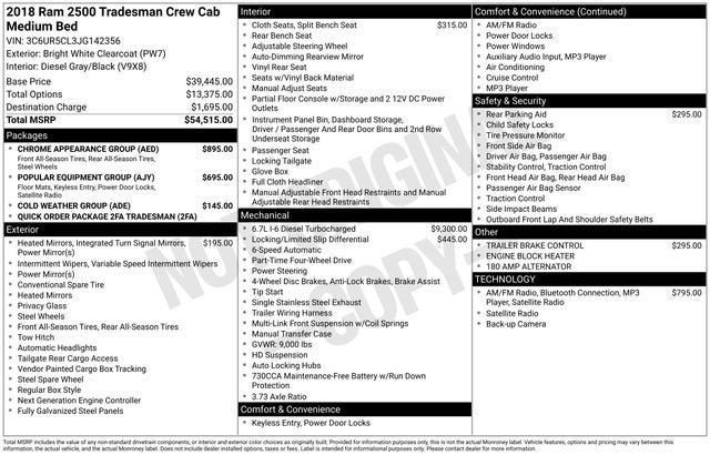 Discover the power and capability of this 2018 Ram 2500 Tradesman. Built with the legendary Cummins 6.7L I6 Turbodiesel engine and 4-wheel drive, this truck is ready to tackle any job or adventure with confidence.