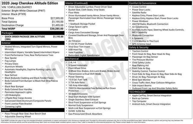 Discover the perfect blend of style, capability, and comfort in this 2020 Jeep Cherokee Altitude. With its sleek exterior and well-appointed interior, this SUV is the ideal choice for those seeking a versatile and sophisticated ride.Boasting a host of premium features, the Altitude package elevates the Cherokee's already impressive capabilities. Enjoy the bold, distinctive look with gloss black exterior accents, including the grille surrounds, side roof rails, and badging. The black accent stitching and piano black interior accents add a touch of sophistication, while the 18-inch gloss black aluminum wheels lend an undeniably stylish presence.• Quick Order Package 2BN Altitude• Gloss Black Exterior Accents• Gloss Black Exterior Badging• Gloss Black Grille Surrounds• Black Accent Stitching• Piano Black Interior Accents• Gloss Black Side Roof Rails• 18 Gloss Black 5-Spoke Aluminum WheelsUnder the hood, the 2.4L I4 engine paired with the 9-speed automatic transmission delivers an impressive balance of power and efficiency, with an EPA-estimated 22 city and 31 highway mpg. Whether navigating the city streets or exploring the open road, this Jeep Cherokee Altitude offers the perfect blend of performance and practicality.Step inside and experience the refined cabin, complete with premium cloth and vinyl bucket seats, a leather-wrapped steering wheel, and a 7-inch Uconnect touchscreen infotainment system with Apple CarPlay and Android Auto compatibility. Stay connected and entertained on every journey, while the available driver-assistive technologies, including the ParkView Rear Back-Up Camera, provide added peace of mind.Designed to adapt to your active lifestyle, the Jeep Cherokee Altitude offers ample cargo space and versatile seating configurations, allowing you to easily accommodate your gear, passengers, and everything in between. With its impressive combination of style, technology, and capability, this SUV is the perfect companion for your next adventure.We invite you to experience the 2020 Jeep Cherokee Altitude for yourself. Schedule a test drive today and discover the exceptional value and uncompromising quality that this vehicle has to offer. We're confident you'll be impressed by its refined design, advanced features, and exceptional performance. Let us help you find the perfect Jeep to elevate your driving experience.