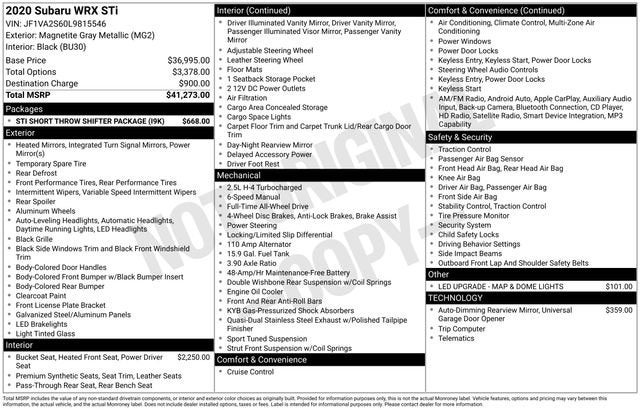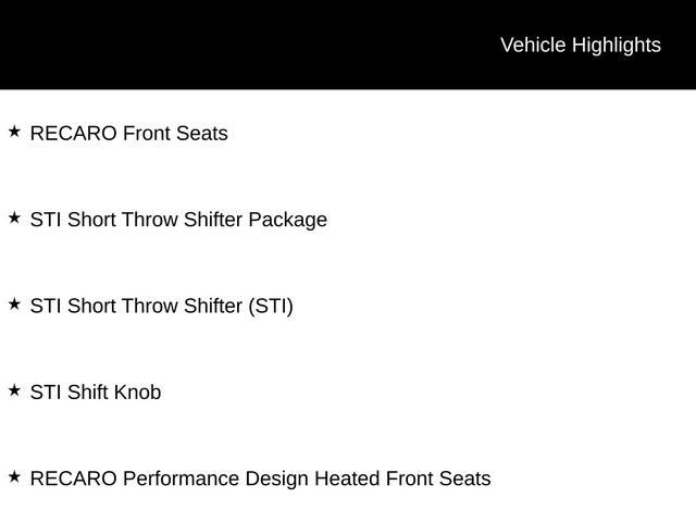 Introducing the thrilling 2020 Subaru WRX STi, a true driver's delight that combines uncompromising performance with exceptional versatility. This captivating sports car is the perfect blend of power, precision, and style, making it the ultimate choice for the discerning automotive enthusiast.Adorned in a sleek Gray exterior, this WRX STi commands attention wherever it goes. Beneath the sculpted hood lies a potent 2.5L DOHC Intercooled High Boost Turbocharged engine, mated to a Close-Ratio 6-Speed Manual transmission and Subaru's legendary Symmetrical All-Wheel Drive system. With 16 city and 22 highway MPG, this exhilarating machine delivers an unparalleled driving experience without sacrificing efficiency.- RECARO Front Seats- STI Short Throw Shifter Package- STI Short Throw Shifter (STI)- RECARO Performance Design Heated Front Seats- STI Shift KnobThe WRX STi's impressive list of features is designed to elevate your driving experience to new heights. Indulge in the comfort and support of the RECARO Performance Design Heated Front Seats, while the STI Short Throw Shifter Package ensures precise, engaging gear changes. The Auto-Dimming Mirror with Compass and HomeLink provides added convenience, and the LED Upgrade for the Map and Dome Lights enhances the vehicle's modern, high-tech aesthetic.Step inside the cabin and you'll be greeted by a host of premium amenities, including the Subaru STARLINK 7.0 Multimedia Plus System with Apple CarPlay and Android Auto integration, dual-zone automatic climate control, and a leather-wrapped steering wheel. The Ultrasuede upholstery with leather bolsters adds a touch of refined sportiness, while the split-folding rear seat offers versatile cargo-carrying capabilities.Safety is equally paramount, with features like Subaru's advanced EyeSight Driver Assist Technology, Dual Front Impact Airbags, and a Rear-View Camera ensuring your peace of mind on every journey.This 2020 Subaru WRX STi is a true performance icon, blending exhilarating power, exceptional handling, and a wealth of premium features. Experience the thrill of driving perfected – schedule a test drive today and discover the true essence of the WRX STi.