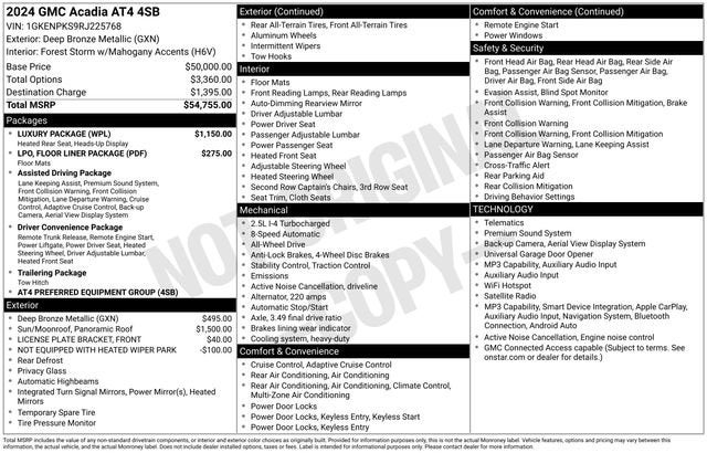 Elevate your driving experience with the 2024 GMC Acadia AT4, a sophisticated and capable SUV that blends rugged performance with refined luxury. Boasting a striking Brown exterior and an array of premium features, this Acadia is primed to exceed your expectations.- Panoramic Sunroof with Sunshade- Luxury Package with Heated Rear Seats, Heated Wiper Park, and 8 Head-Up Display- Navigation System- Heated and Ventilated Front Seats- Laminated Acoustic Glass for a serene cabinThe Acadia AT4's 2.5L DOHC engine and 8-speed automatic transmission deliver a smooth, responsive ride, while the standard All-Wheel Drive system provides confident traction in all conditions. With an EPA-estimated 19 MPG city and 24 MPG highway, this SUV balances power and efficiency to elevate your daily commute.Beyond its impressive performance, the Acadia AT4 pampers you with a wealth of thoughtful amenities. Sink into the premium Cloth/CoreTec seats and enjoy the convenience of the 15 Premium GMC Infotainment System, complete with Apple CarPlay and Android Auto integration. The Bose Performance 12-Speaker audio system will immerse you in your favorite music, while the Heated Steering Wheel and Dual-Zone Automatic Climate Control ensure your comfort.Safety is also a top priority, with features like Rear Park Assist, Blind Spot Monitoring, and a Surround Vision Camera System to help you navigate with confidence. The Acadia AT4 also boasts a comprehensive suite of advanced driver-assistance technologies to give you added peace of mind.Whether you're embarking on a family adventure or seeking a sophisticated daily driver, the 2024 GMC Acadia AT4 is poised to exceed your expectations. Experience the perfect blend of capability, technology, and refinement by scheduling a test drive at our showroom today.