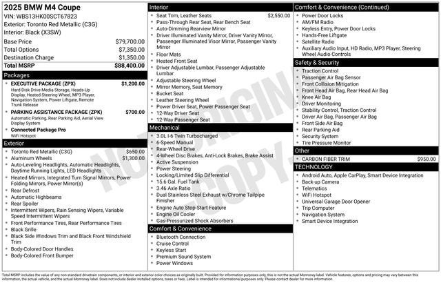 Discover the thrilling performance and premium amenities of this exceptional 2025 BMW M4 Base. With its powerful 3.0L I6 Turbocharged engine delivering 473 horsepower, this sleek sports coupe is engineered to deliver an unparalleled driving experience. Adorned in a stunning Red exterior, this M4 Base is equipped with an impressive array of features that elevate both style and functionality.